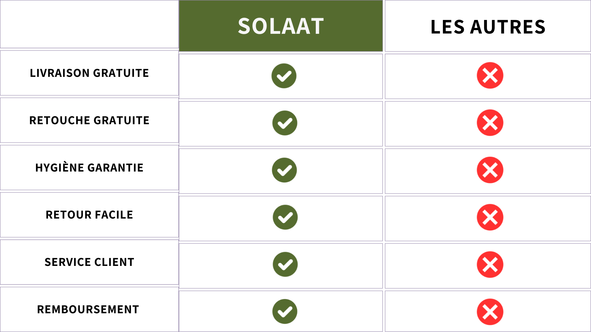 Oui, chez Solaat, votre satisfaction est notre priorité. Si un article ne vous convient pas, vous pouvez le retourner. Vous pouvez lire les conditions dans notre Politique de retour et de remboursement